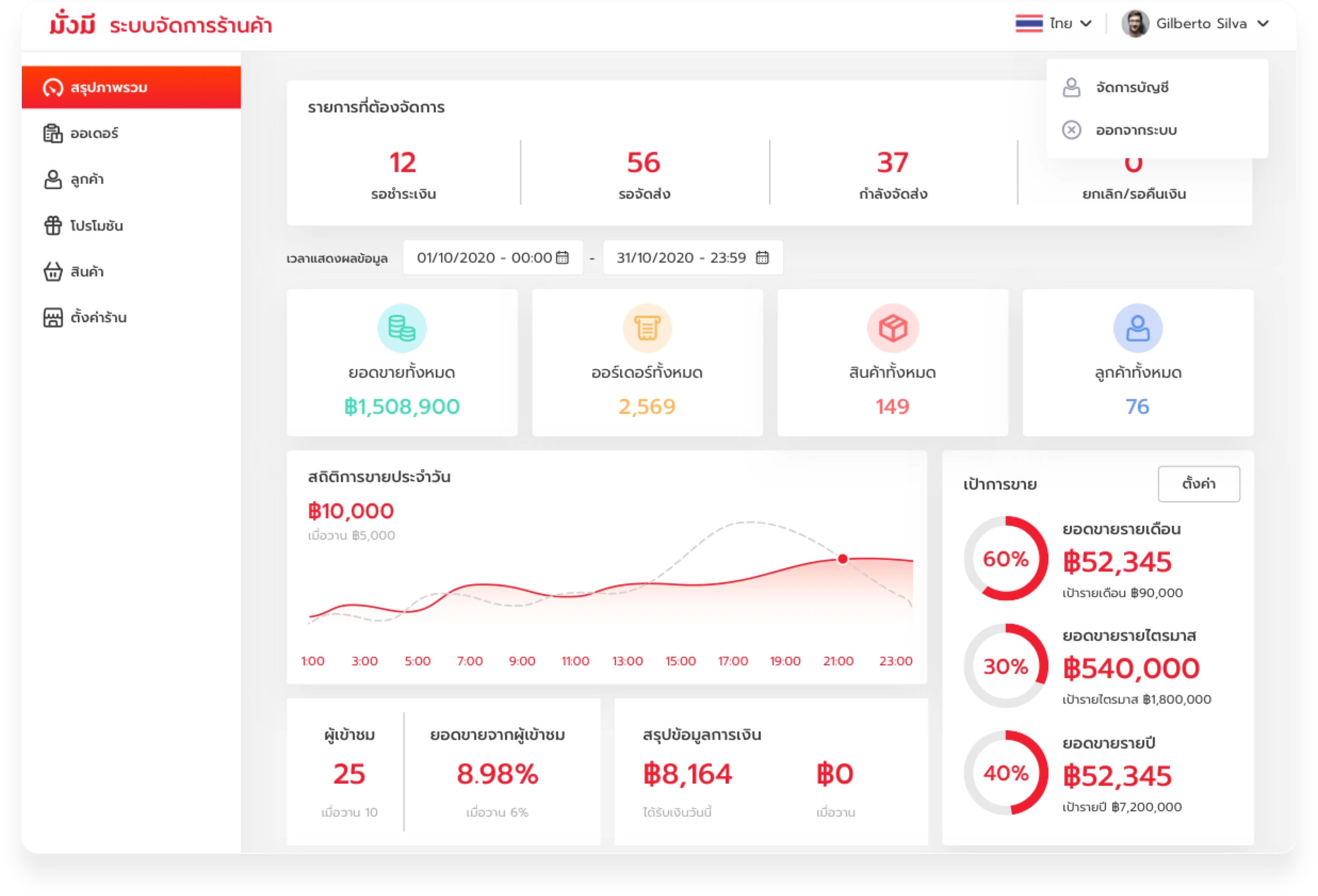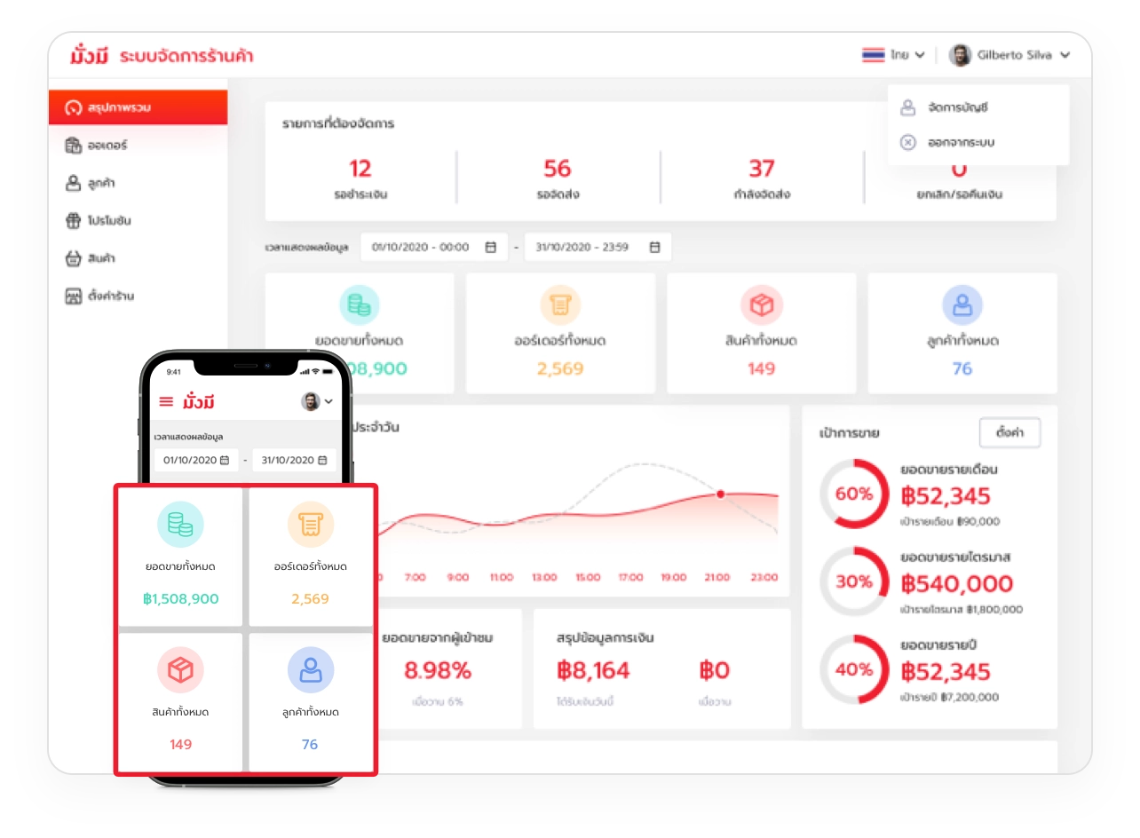 ระบบจะสรุปภาพรวมร้านค้าให้คุณติดตามรายงานออเดอร์ ยอดขาย เป้าขาย และสินค้าขายดี ตามช่วงเวลาที่ต้องการ ในจอเดียวพร้อมแสดงสรุปรายการที่ต้องจัดการประจำวัน