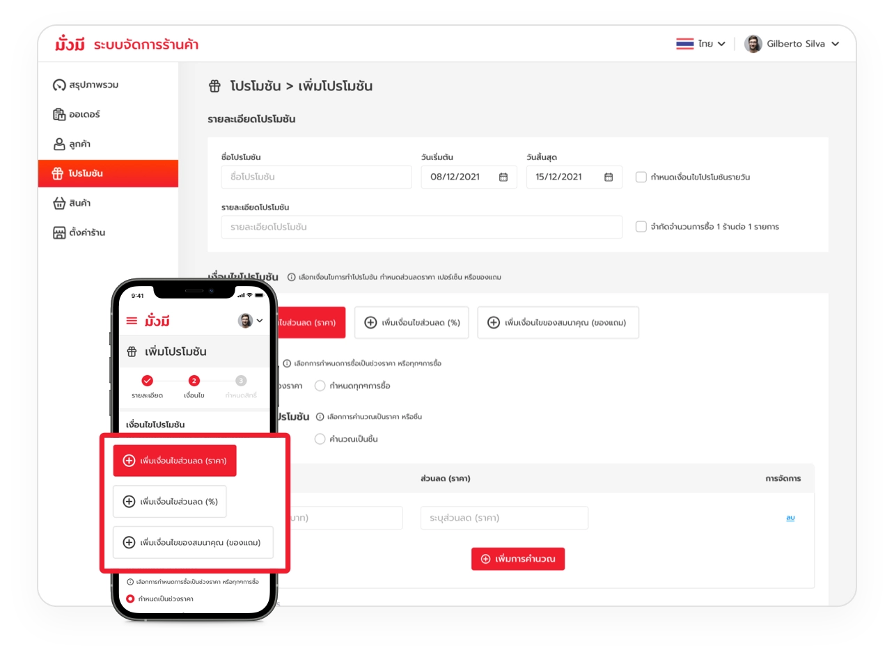 มั่งมีถูกออกแบบมาเพื่อรองรับการสร้างโปรโมชันรูปแบบต่างๆ เช่นการลดราคา หรือการแถมสินค้า และยังสามารถคัดลอกโปรโมชันจากแบรนด์และกระจายต่อให้ลูกค้าของคุณได้อย่างสะดวก และสามารถเลือกกลุ่มลูกค้าที่จะได้รับดีลพิเศษได้ด้วย