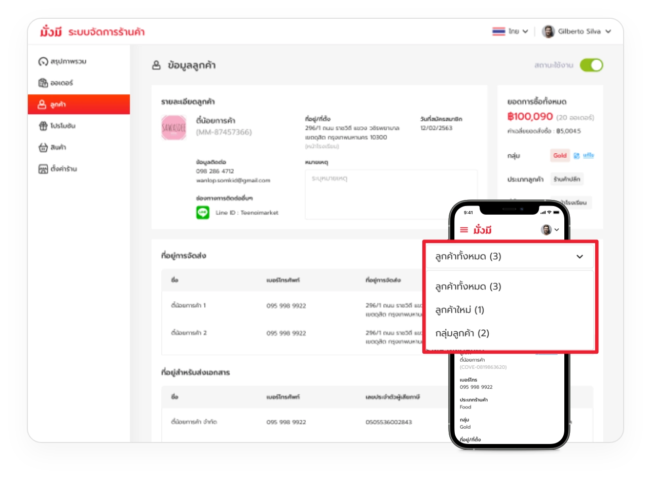 มีระบบจัดการลูกค้า โดยสามารถแบ่งระหว่างลูกค้าใหม่และลูกค้าปัจจุบัน และยังสามารถจัดกลุ่มลูกค้าตามที่คุณต้องการเพื่อกำหนดราคา และโปรโมชันให้ตรงกลุ่มลูกค้า